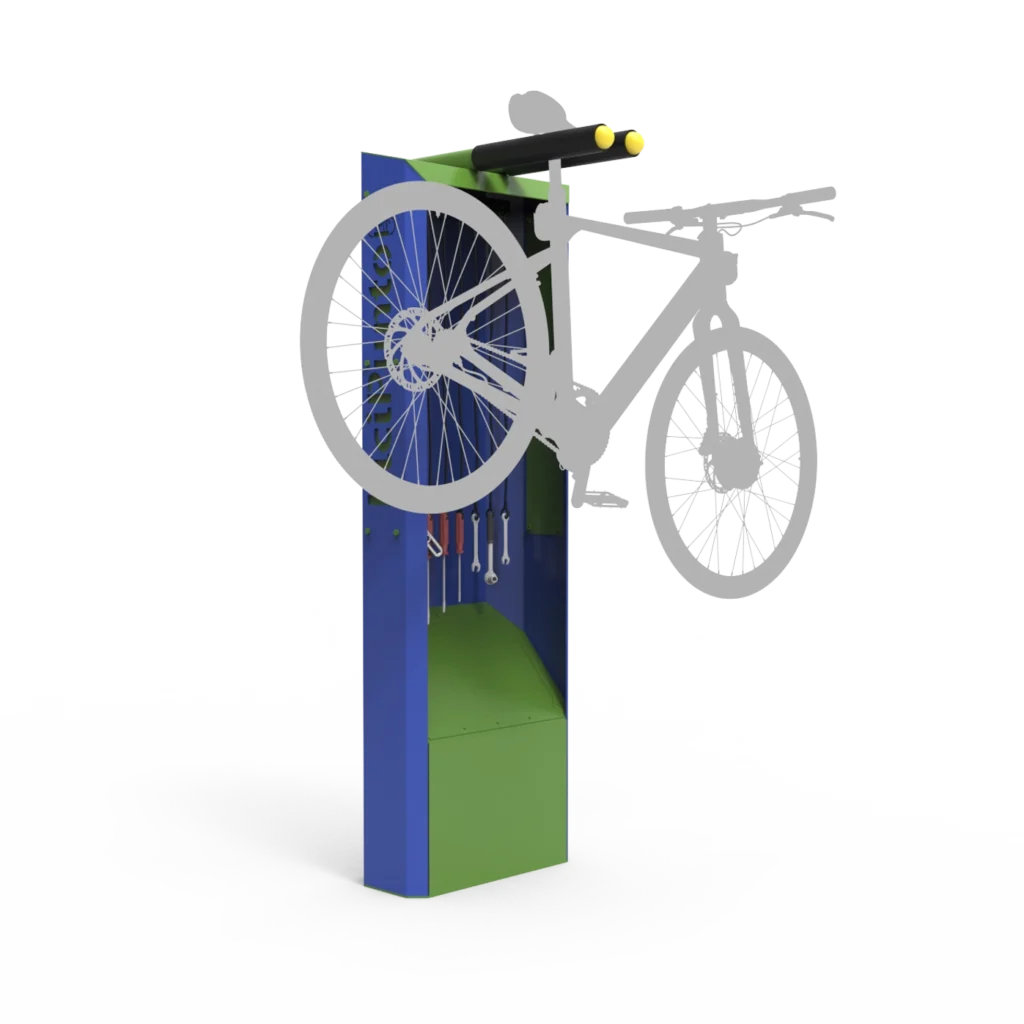 Pensado para ofrecer una solución práctica y eficiente, el Punto de Auto reparación Basico de Bicipunto® brinda a los ciclistas acceso a diversas herramientas de alta calidad para realizar ajustes y reparaciones en cualquier momento. Su diseño integrado con un bombín a pedal permite inflar neumáticos con facilidad, y su forma permite un mantenimiento rápido y cómodo de la bicicleta.